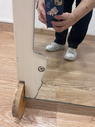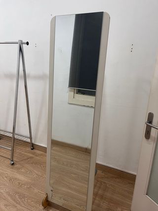 Mueble perchero con espejo grande, en buen estado. - Marco de madera en tono beige. - Espejo de cristal. - Base de madera en blanco