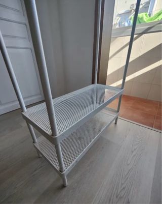 Práctico perchero zapatero de la marca Ikea. Ideal para organizar tu ropa y calzado. - Estructura de metal resistente. - Dos baldas inferiores para zapatos. - Barra superior para colgar ropa. Son dos estructuras por 40€ La segunda le falta la ultima balda (de ahí el precio) pero se puede utilizar de igual manera. Mirar bien las fotos!