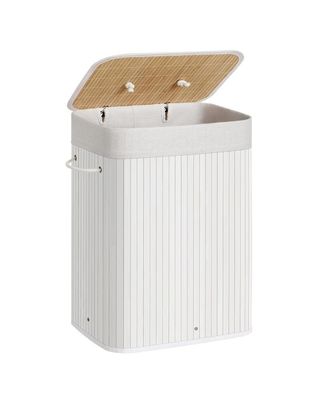 SONGMICS Cesto de la Ropa Sucia con Tapa, 72 L, Cesta de Lavandería de Bambú, Plegable, con Bolsa Lavable Extraíble, Asas, para Lavandería, Dormitorio, Blanco LCB010W01 Cesto de la ropa sucia con tapa: La tapa del cesto se abre y se cierra con una sola mano para facilitar el depósito de la ropa sucia. La tapa evita que los olores de la ropa sucia se propaguen y protege la colada del polvo Hecho de bambú, estable y robusto: Este cesto está hecho de bambú natural. Gracias a las tiras de bambú de 17 mm de ancho, el cesto para la ropa es extremadamente robusto y estable y puede soportar hasta 10 kg Bolsa interior resistente y extraíbl