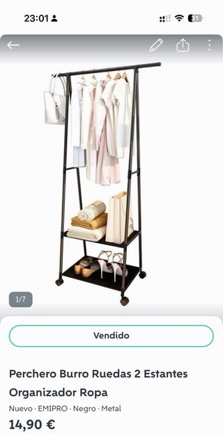 Perchero plegable con un diseño moderno y funcional. - Estructura de metal resistente. - Acabado en color negro. - Diseño plegable para fácil almacenamiento. De buena calidad, precio nuevo, más o menos 30€ por unidad, vendo a 10€ unidad o las dos por 15