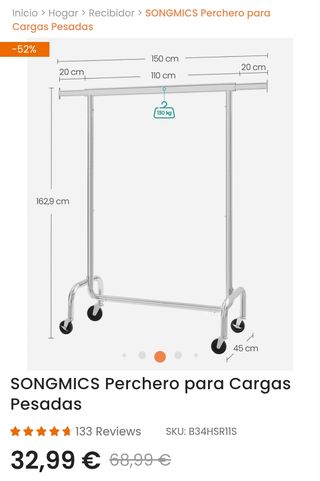 SONGMICS Perchero para Cargas Pesadas la barra plana superior tiene una alta capacidad de carga y es extensible Fabricado de metal cromado (espesor de la pared: 1 mm) Rodajas con freno Especificaciones: - Dimensiones del producto: (110-150) x 55 x 160 cm (Largo x Ancho x Alto) - Embalaje: 117 x 58,5 x 18 cm - Color: Plateado - Material: Tubos Cromado, Ruedas de PP - Capacidad de carga: 130 kg - Peso neto: 7,4 kg - Peso bruto: 9,4 kg Contenido de paquete: - 1 x Perchero - 1 x Manual de usuario (ES, DE, EN, FR, IT) - No enviamos nuestros productos a las Baleares ni las Canarias.