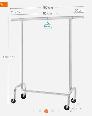 SONGMICS Burro Ropa con Ruedas, Perchero Burro Extensible con Carga Pesada, Capacidad de Carga de 130 kg, 45 x (110-150) x 162,9 cm, Fácil de Montar, Portátil, Plata HSR11SV1 Especificaciones: Color: Plata Material: Acero, Ruedas de PP Dimensiones del producto: 45 x (110-150) x 162,9 cm (Profundo x Ancho x Alto) Peso del producto: 7 kg Máx. capacidad de carga estática: 130 kg Capacidad de carga mejorada] Gracias a los tubos de acero de 1 mm de grosor y a las ruedas industriales de PP de alta resistencia, este perchero puede soportar hasta 130 kg. Puedes colgar con seguridad los abrigos y las chaquetas [Barras retráctiles] Las barr