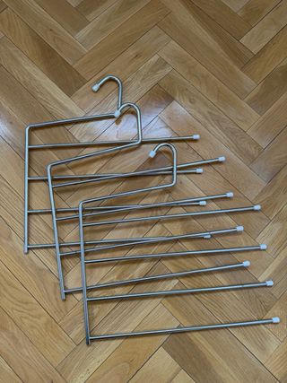 Conjunto de 5 perchas diseñadas para organizar pantalones. - Fabricadas en metal resistente. - Cuentan con puntas de plástico para proteger la ropa. - Diseño multi-barra para colgar varios pantalones a la vez.