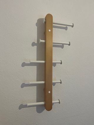 Elegante perchero de pared con un diseño moderno y funcional. - Base de metal resistente. - Ganchos de madera con acabado cálido. - Combina a la perfección con cualquier decoración. Disponibles 2 unidades