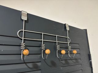 Práctico perchero para colgar en puertas. Ideal para organizar abrigos, bolsos o toallas. - Diseño con múltiples ganchos. - Acabado plateado y detalles en madera.