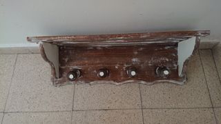 De madera con cuatro colgadores con soporte arriba. con una patina blanca.