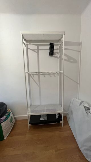 Colgador de ropa comprado hace un mes, muy práctico. - Estructura de metal. - Color blanco.