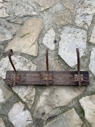 Este perchero combina la robustez de la forja con la calidez de la madera. Necesita restauración por eso el precio. - Diseño rústico y artesanal. - Tres ganchos de forja. - Base de madera con acabado envejecido.