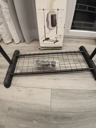 Estantería metálica con perchero, ideal para organizar ropa o accesorios. - Diseño moderno y funcional. - Estructura robusta. Tamaño aproximado 5 metros por 45 de ancho.