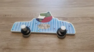 Conjunto de percheros decorativos para pared. - Diseño de coche azul con cocodrilo: 5€ - Base azul oscuro con tres perchas temáticas de tenis, fútbol y baloncesto: 7€ Pack por ambos: 10€