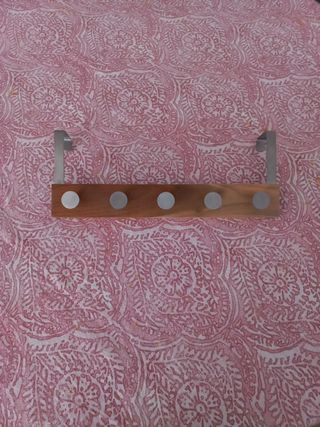 Práctico perchero para colgar en puertas. - Diseño moderno con acabado plateado. - Bolas de madera en los extremos de los ganchos.