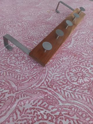 Perchero de madera con cuatro colgadores. Tiene 3 orificios para poner los tornillos y fijarlo a la pared. Presenta evidentes signos de desgaste que pueden ser restaurados. Mide de ancho aproximadamente 43cm.