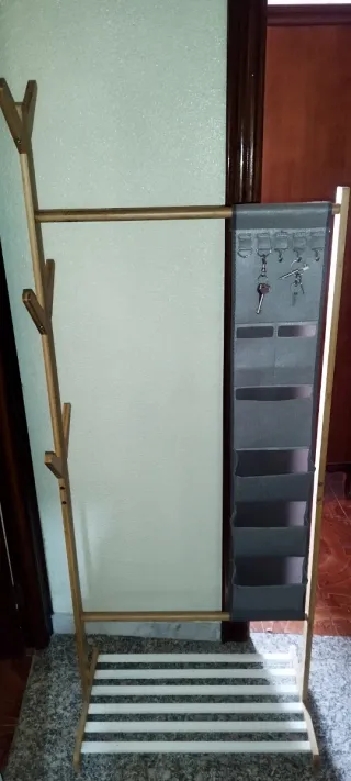 Práctico perchero de bambú con un organizador de tela adjunto. Ideal para mantener tus pertenencias ordenadas. - Estructura principal de bambú. - Organizador de tela con múltiples compartimentos. - Colgador para llaves integrado en el organizador.