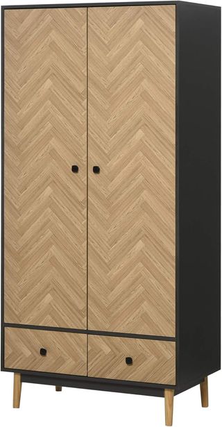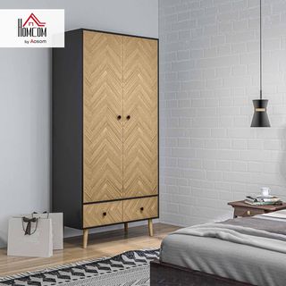 Armario moderno de madera, dimensiones 90L x 50P x 190Acm, con 2 puertas, 4 compartimentos y 2 cajones. Los compartimentos incluyen un perchero de 41cm de largo y espacio para cojines. Cajones internos: 37.9L x 33.7P x 13.1Acm. Fabricado en panel de partículas con vetas de madera, resistente al agua y fácil de limpiar. Patas elevadas de madera de pino para proteger la ropa del polvo y la humedad. Capacidad de peso total 50kg, 5kg para perchero, compartimento y cajón. Montaje necesario. Diseño elegante, ideal para organizar ropa y accesorios.