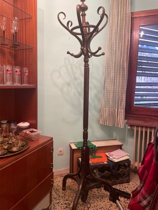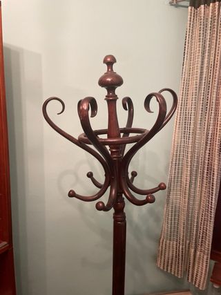 Elegante perchero de pie con un diseño clásico. - Estructura de madera oscura. - Múltiples ganchos para abrigos y sombreros. - Base estable con patas curvas.