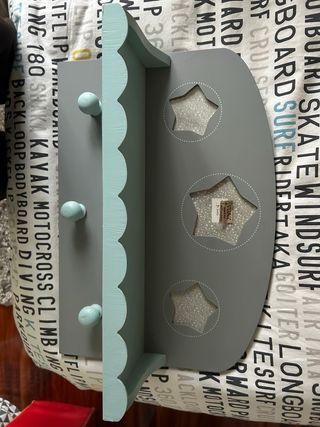 Precioso perchero de madera artesanal. Tiene cinco ganchos de metal con forma de sol, pintados en blanco. Es una pieza única y decorativa, ideal para cualquier entrada.