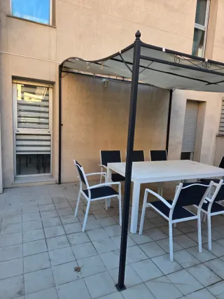 Pérgola de exterior con estructura metálica y cubierta de tela. Color beige. La pérgola mide 3 x 3m. Muy buen estado, solo se ha usado tres meses.