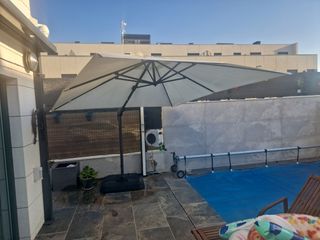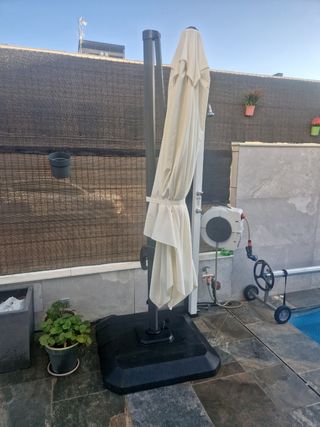 Preciosa sombrilla de terraza para disfrutar del buen tiempo. Se encuentra en perfecto estado. - Medidas: 3x3 metros - Color beige claro - Estructura metálica resistente - Base incluida Comprada hace menos de un año. Se vende por que hemos montado pergola. Esta nueva, tiene hasta el código de barras de la tienda. Abierta 4 veces.Nos costó 600€