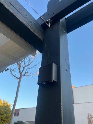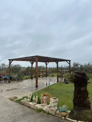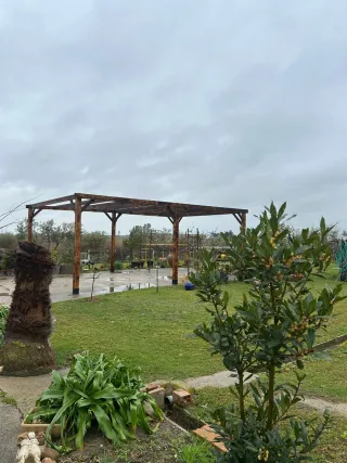 Vendo pérgola de madera tratada, ideal para jardín o terraza grande. Estructura muy robusta y espaciosa (más de 20 M2 de sombra). - Medidas: 4,50m largo x 4,50 de ancho. - Altura: 2,60 m (permite estar debajo con total amplitud). - Estado: Estructura sólida, sin carcoma ni daños estructurales. - Estructura: Consta de 4 postes robustos, vigas de carga laterales y un listón central de refuerzo. - Incluye sistema de iluminación integrado con canalización oculta bajo pletina de aluminio con focos. Precio negociable si el comprador se encarga del desmontaje.