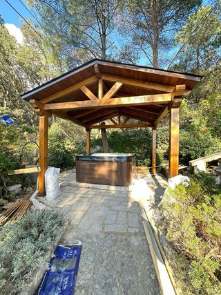 Cenador de 3x3 metros de madera de pino y cubierta con teja asfáltica. Trabajamos todo tipo de obra, porches a medida, pérgolas... madera tratada. Nos adaptamos tanto a pequeños como a grandes proyectos, nos dices tu idea y vemos la mejor forma de llevarla a cabo según tu presupuesto. Solicitanos una visita técnica sin compromiso. Rubén: 617814784.