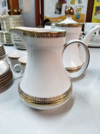 Elegante juego de té de porcelana con un delicado filo dorado. - Incluye jarra para leche o agua: 19 cm de alto. - Cafetera: 25 cm de alto. - Azucarero. - 5 tazas. - 6 platillos. - 6 platos de postre: 19 cm de diámetro.