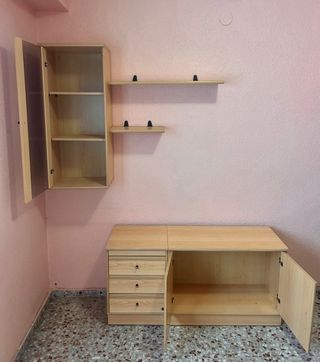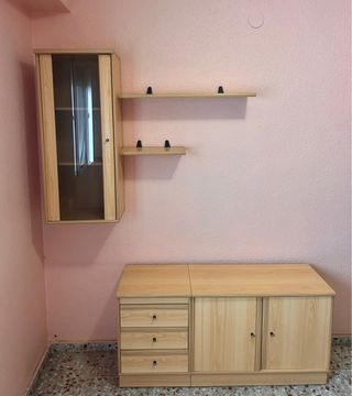 Conjunto de muebles para almacenamiento. Estanteria con vitrina incluida Mueble con tres cajones y amplio espacio Medidas vitrina: 42x30x96,5 Medida mueble con cajonera: 122x39x60 Comprador se encarga de desmontar y recoger