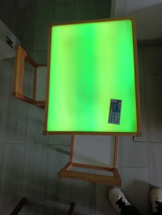 Mesa de luz con marco de madera y superficie iluminada en verde. - Marco de madera. - Superficie de plástico translúcido. - Control remoto incluido para ajustar la iluminación.