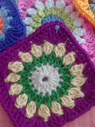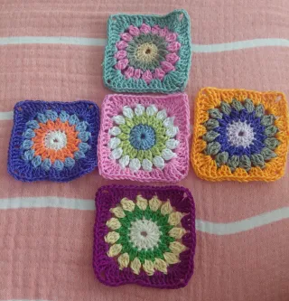 5 cuantos granny de algodón, 10 ctm, hechos a mano, ganchillo, crochet, uncinetto, handmade, artesanía Conjunto de cinco cuadros decorativos hechos a mano con la técnica granny de crochet. - Material: Algodón. - Diseño: Flores. - Colores variados.