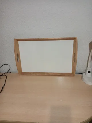 Bandeja de madera con un diseño elegante y práctico. - Material: Madera. - Color: Madera natural y blanco. - Asas laterales para facilitar el transporte.