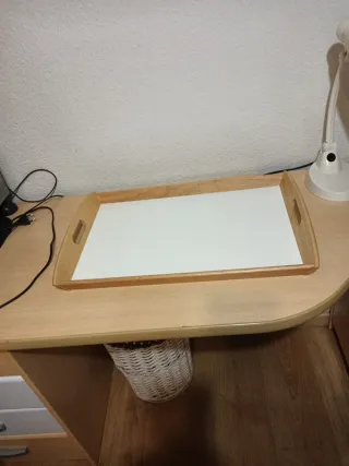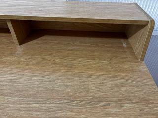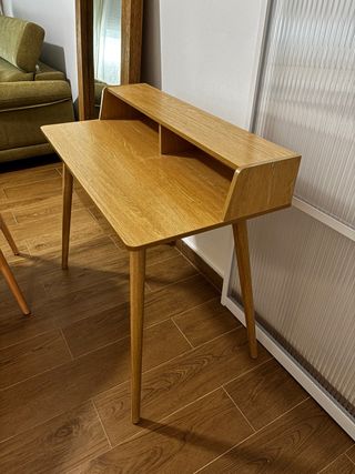 Elegante escritorio con un diseño moderno y funcional. - Acabado en madera clara. - Patas cónicas. - Estante superior con compartimento. Tiene una marca casi imperceptible, por eso el precio.