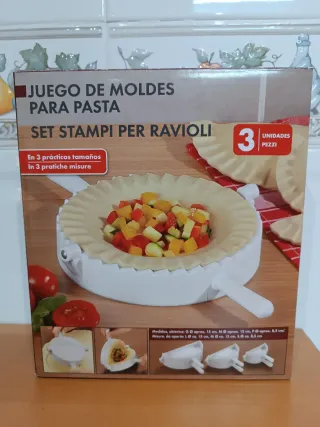 Juego de moldes para hacer pasta fresca en casa. Incluye tres tamaños diferentes para crear raviolis. - Tres unidades incluidas. - Medidas de los moldes abiertos: Grande aprox. 15 cm, Mediano aprox. 12 cm, Pequeño aprox. 8.5 cm.
