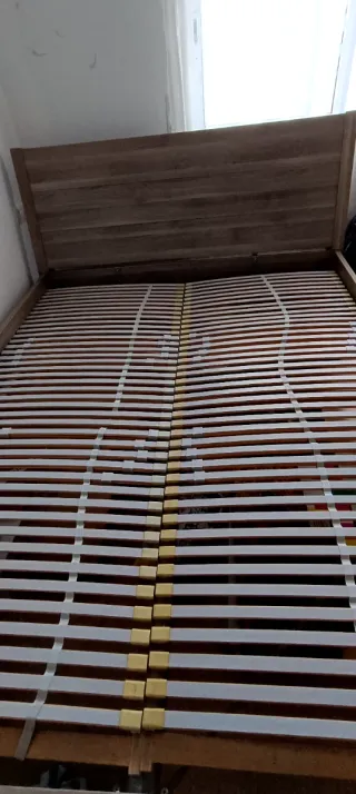 Estructura de cama de matrimonio con un diseño moderno y funcional. Combina materiales para ofrecer durabilidad y estilo. - Base de láminas de madera. - Marco exterior de madera. - Soportes de plástico para las láminas.