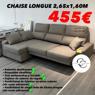 Chaise longue de la marca Cuesta Confort. Totalmente nuevo sin ningun tipo de uso. Fabrica profesional. Medidas estandar de : 2,65x1,60 m -> 455€ 3,00x1,60 m -> 525€ - Asientos deslizantes. - Respaldos abatibles. - Tela antimanchas y lavable. - Cojines de adorno de regalo. - Posibilidad de fabricar en otros colores (sin coste adicional). - Posibilidad de elegir lado de Chaise longue (sin coste adicional). HACEMOS ENVIOS A DOMICILIO CON PAGO CONTRA REEMBOLSO. NUNCA COBRAMOS NADA POR ADELANTADO. 645 686 081 614 059 938 SE PUEDE VER Y PROBAR EN TIENDA. Avenida Alcalde Jesus Calderon Moreno 58. Pilas, Sevilla.