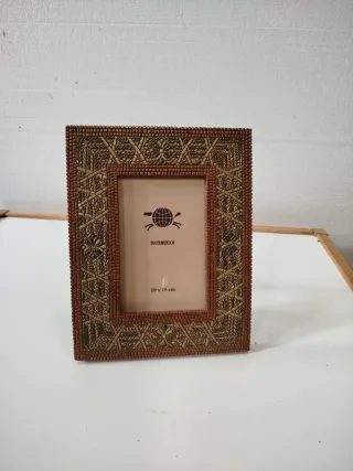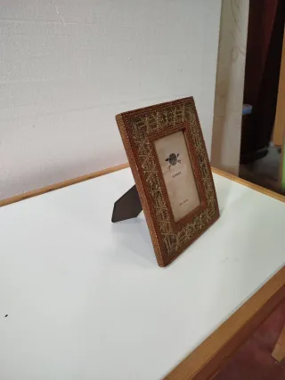 Elegante portafotos de sobremesa con un diseño único. - Marco elaborado con piezas de hueso. - Ideal para colocar en escritorios o repisas.
