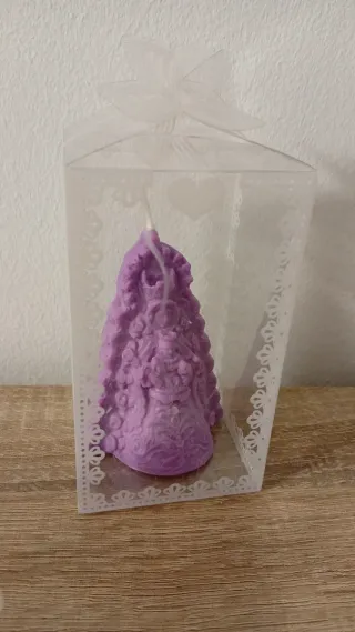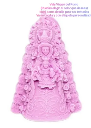 Vela con la figura de la Virgen del Rocío, ideal para detalles. Van un su cajita y con etiqueta personalizada Puedes elegir el color que mas te guste Se hacen por encargo Miden 8cm de alto