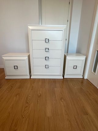 Conjunto de cómoda y dos mesitas de noche en color blanco. - Diseño moderno con tiradores metálicos. - Cajones amplios para almacenamiento. -Medidas de la cómoda 121cm alto, 80cm ancho, 51 fondo. -Medida mesita de noche 59 y 48 ancha (1 es mas ancha que la otra) 58cm alta y 42 fondo
