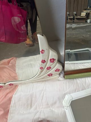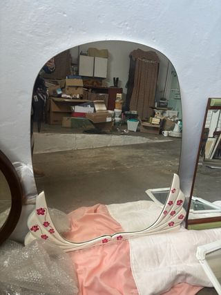 Precioso espejo con un diseño único y detalles florales. - Forma ovalada con base decorativa. - Adornos de flores en color rosa. - Marco con acabado blanco.
