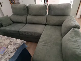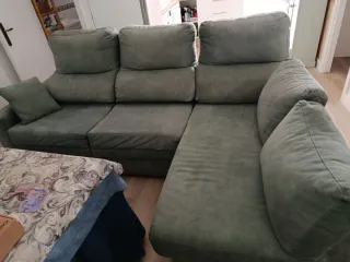 Sofá chaise longue de tela en color verde. Esquinero muy cómodo y espacioso. - Medidas 2'60 x 1'60. Me costó 600 euros - Diseño moderno y funcional. - Cojines mullidos para mayor confort. Posibilidad de envío.
