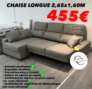 Chaise Longue NUEVO. OFERTA ONLINE Y EN TIENDA. ✅ • ASIENTOS DESLIZANTES • RESPALDOS ABATIBLES. • TELA ANTI MANCHAS Y LAVABLE. • COJINES DESENFUNDABLES. • GOMAS DE ASIENTO DE ALTA FIRMEZA. ELIGE EL COLOR QUE MAS TE GUSTE DENTRO DE NUESTRA AMPLIA GAMA DE COLORES. MEDIDA DE 2,60X1,60 CM. ✅PAGO CONTRA REEMBOLSO Y EN SU DOMICILIO. NUNCA COBRAMOS NADA POR ADELANTADO. 📍TIENDA FISICA UBICADA EN PILAS, SEVILLA. AVENIDA ALCALDE JESUS CALDERON MORENO 58. Teléfonos de contacto ☎️ 614 059 938 645 686 081
