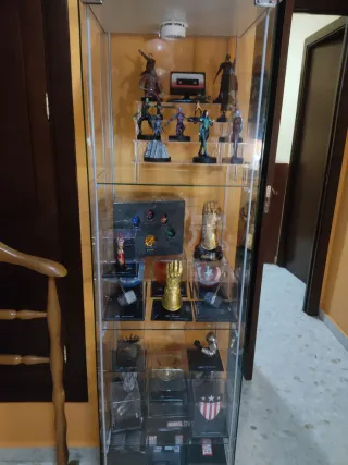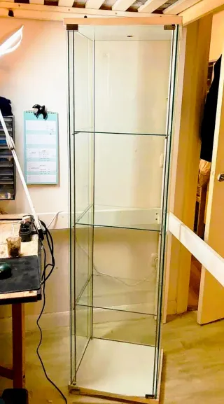 Vitrina de cristal de Ikea, modelo Detolf. Ideal para exponer colecciones o decoraciones. - Estructura con paneles de cristal. - Base y parte superior de madera. - Diseño moderno y minimalista.