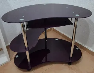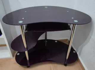 Elegante mesa de escritorio con un diseño moderno y curvilíneo. Sus superficies de cristal morado y estructura metálica plateada le dan un toque sofisticado. - Diseño moderno y elegante. - Superficies de cristal. - Estructura de metal.