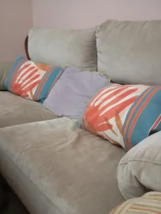 Sofá de tres plazas con un diseño moderno y cómodo. Sus cojines añaden un toque de color y estilo a tu salón. - Tapicería de tela. - Cambiada las espumas recientemente. - Cojín central en tono lila.