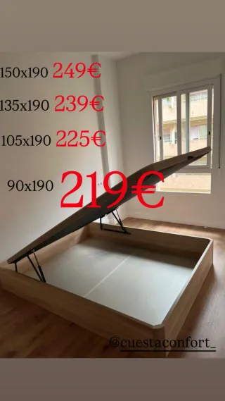 Pistones hidráulicos de gran potencia, se abre sin esfuerzo.💪🏼 ✅Fácil apertura. 🎨Colores: blanco, cambrian y wengue. Disponemos de todas las medidas: Desde 90x190 hasta 200x200 Medidas y precios : 👇🏼 90x190cm - 219€ 105x190cm - 225€ 135x190cm - 239€ 150x190cm - 249€ 🛏️Colchones desde 99€ 💤Almohadas desde 11€ 🛏️Cabeceros desde 85€ 📦🚚Entrega rápida hasta su domicilio, pago contra reembolso HUELVA, CÁDIZ Y SEVILLA. ☎️Para más información : 614059938 645686081