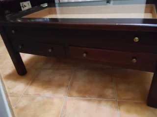 Elegante mesa de centro con un diseño moderno. - Marco de madera oscura. - Superficie de cristal. - Base con un patrón de puntos.medidas: 1'10x0'65x0'45