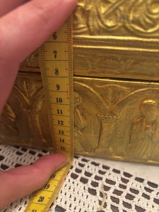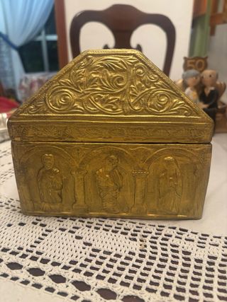 Precioso cofre de escayola con un acabado dorado y detalles en relieve. - Diseño con figuras y motivos florales. - Tapa con forma piramidal.