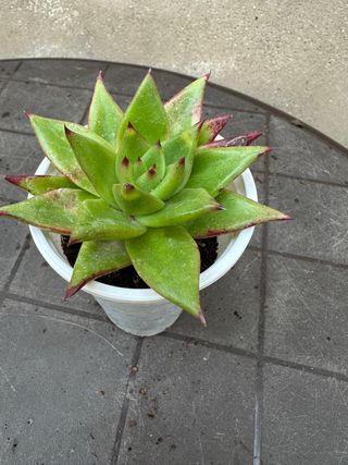 Planta suculenta Echeveria. - Hojas verdes con bordes rojizos. - Textura aterciopelada en las hojas. - Forma de roseta compacta.