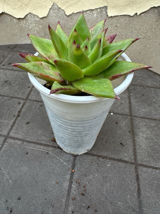 Se vende lote de dos plantas suculentas. - Una planta tipo Aeonium con hojas verdes y bordes rojizos. - Una planta tipo Senecio 'String of Pearls' variegada con hojas redondas y blancas/verdes.