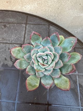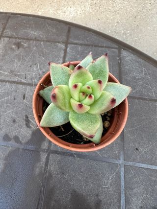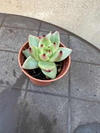 Planta suculenta Echeveria en maceta. - Hojas de color verde azulado con puntas rojas. - Aspecto compacto y roseta. - Ideal para coleccionistas de suculentas.