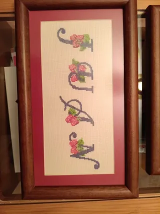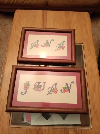 Conjunto de dos cuadros decorativos hechos a punto de cruz. Uno muestra el nombre JUAN y el otro ANA, ambos con detalles florales. - Diseños bordados a mano. - Marcos de madera con paspartú rosa. Precio por unidad