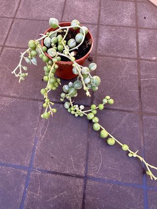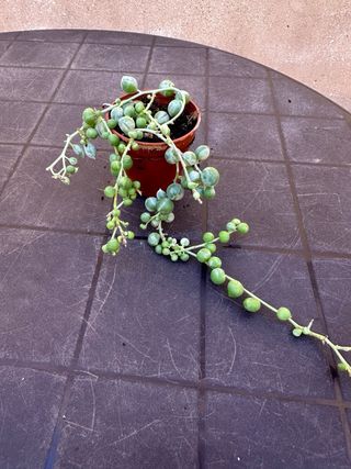 Planta Senecio de collar en maceta. - Hojas verdes en forma de perla. - Ideal para colgar o decorar.